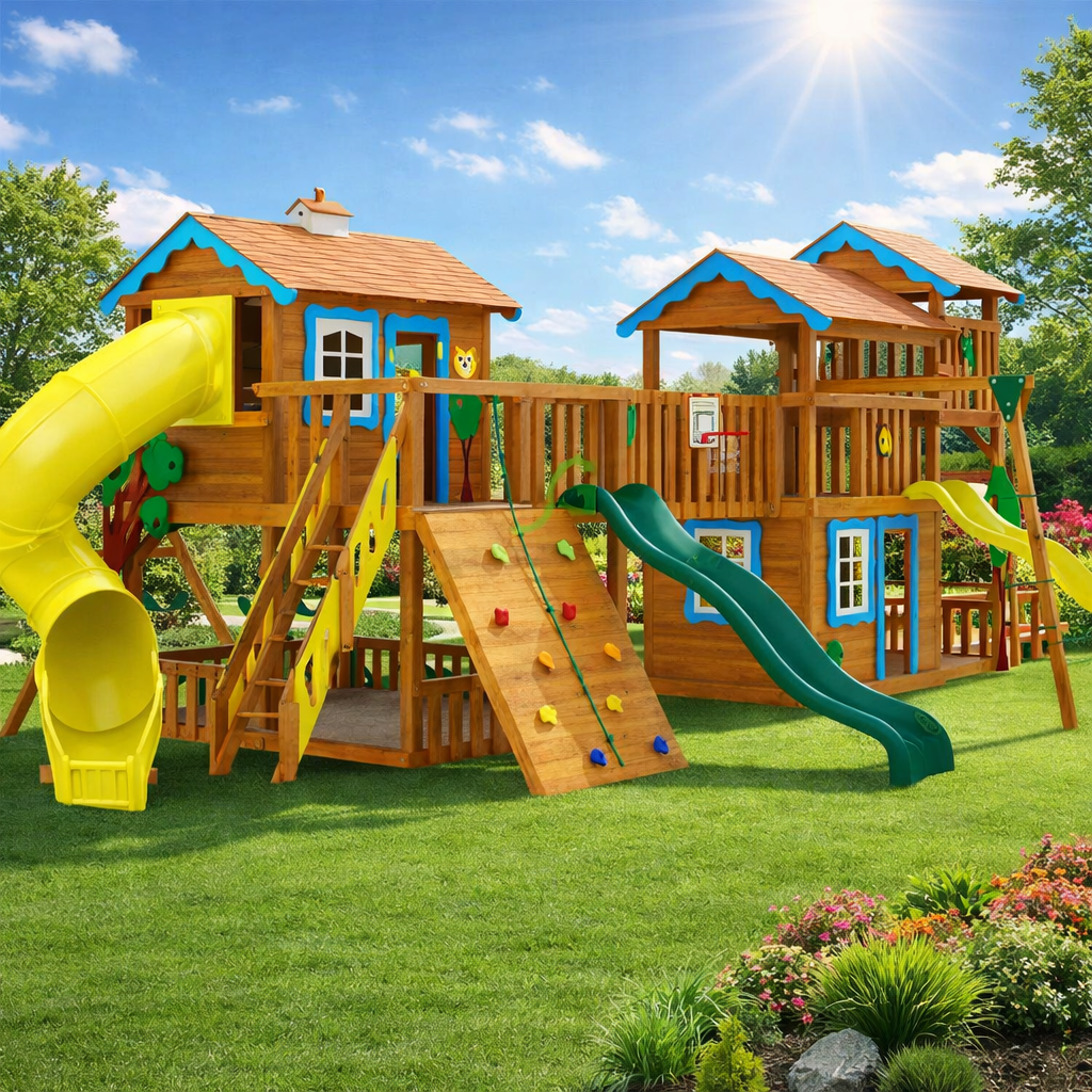 Просто огромный комплекс для детей красиво впишется в ландшафт загородного дома, его стильные башенки с белыми окошками на фоне сочной зелени украсят ваш сад. А самое главное, множество развлечений надолго отвлекут детей от вредных гаджетов, позволят выманить малышей-домоседов на свежий воздух. Разнообразные спортивные снаряды гарантированно будут воздействовать на все группы мышц мальчишек и девчонок. Ведь в площадке есть рукоход, скалодром, канат, лестницы и 4 горки для самых отважных. А для романтичных принцесс и творческих натур предусмотрены разного вида качели, доска для рисования, игра «крести-нолики» и игровой прилавок.