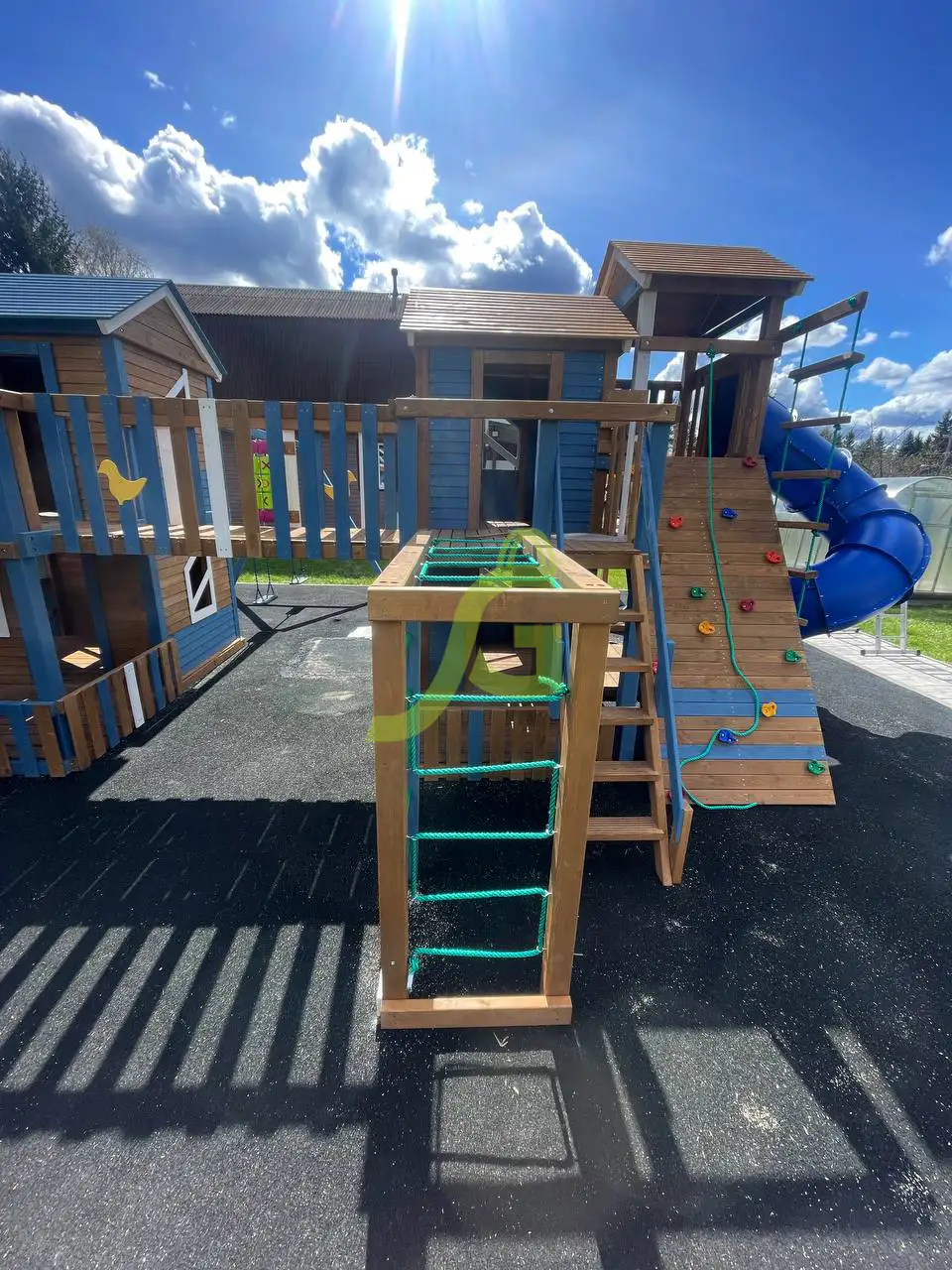 Для юных покорителей вершины предусмотрен большой скалодром с канатом, рукоход и г-образный модуль с канатом для скалолазания. Внутри домиков достаточно много свободного пространства, которое приютит небольшую компанию детей для настольных игр, детских посиделок. Поработать интеллектом можно во время игры в крестики-нолики».
