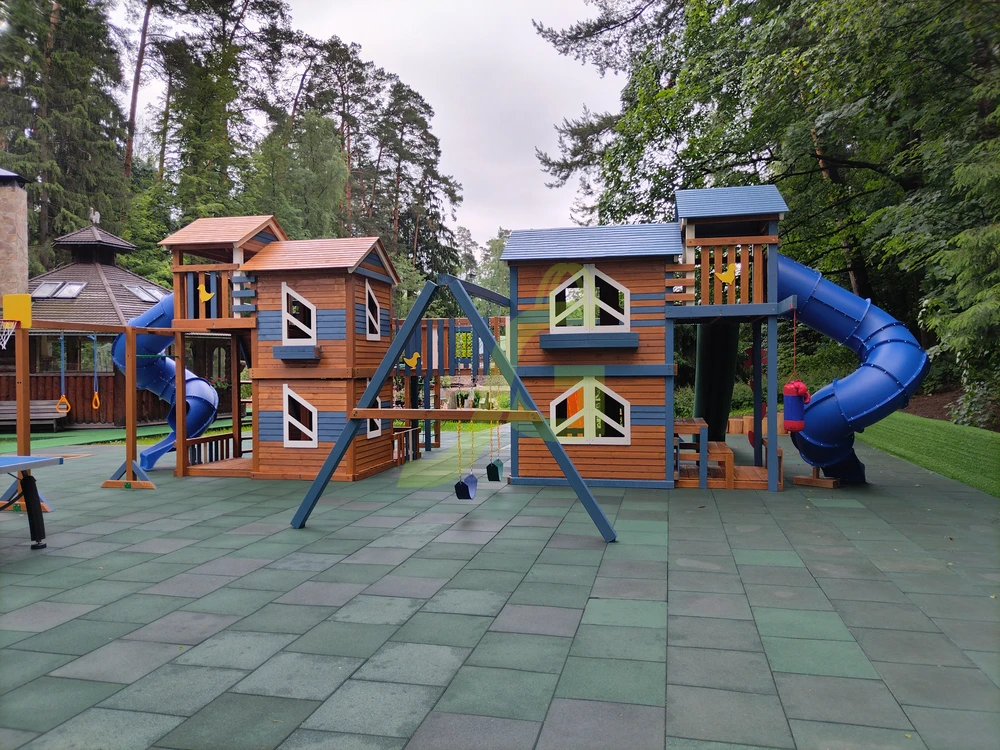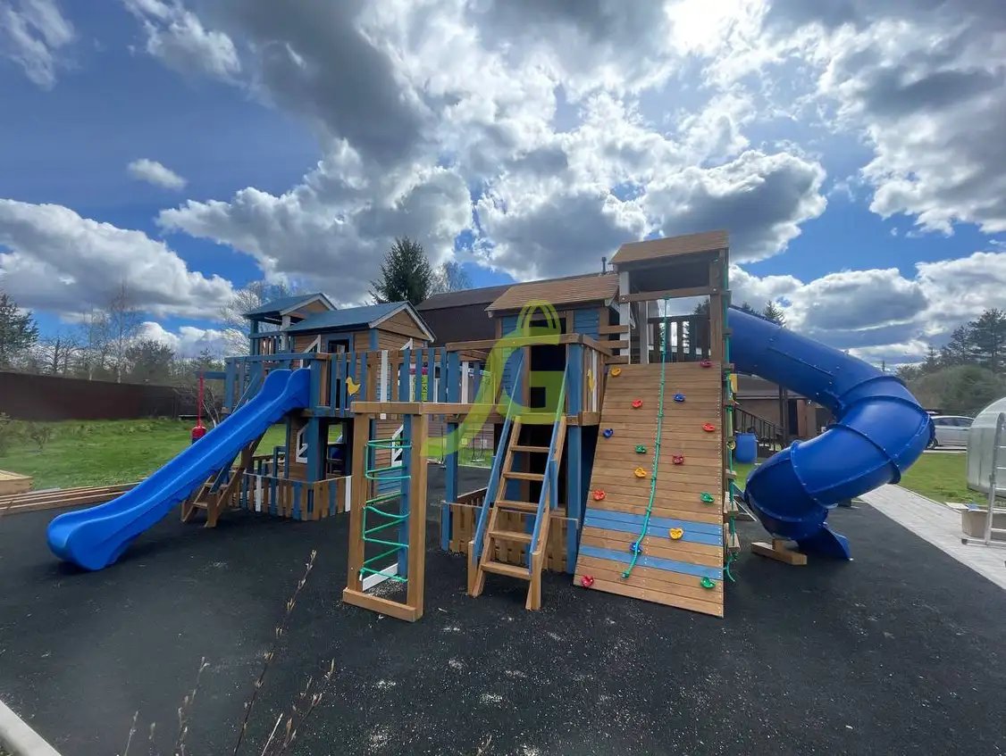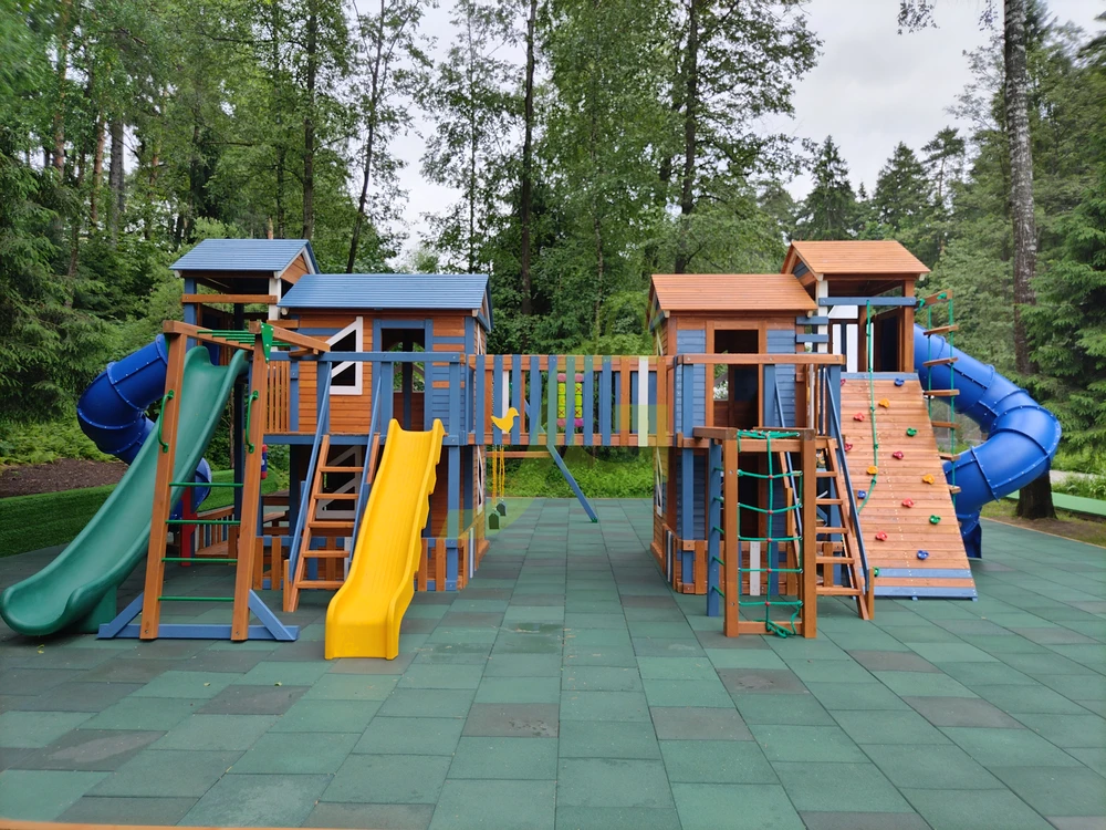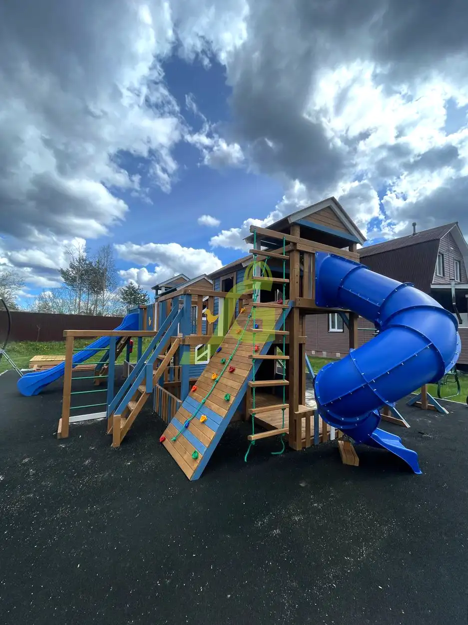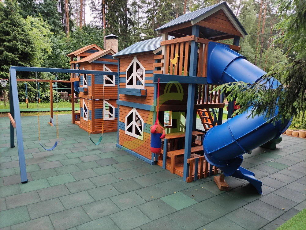 Грандиозный деревянный комплекс укомплектован сразу несколькими игровыми домиками, соединенными между собой переходами-мостиками. Это двухуровневые башни с домиками и верандами, с дизайнерскими окошками и четырьмя горками – волновыми разной длины и горками в виде труб.