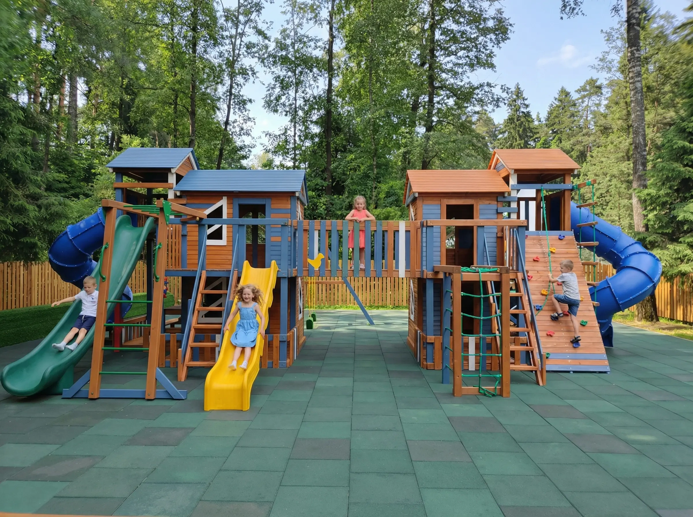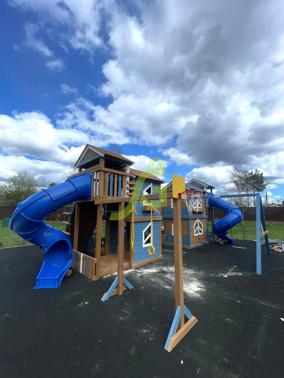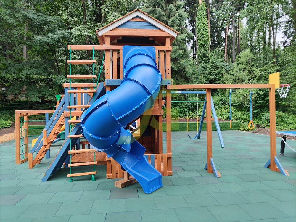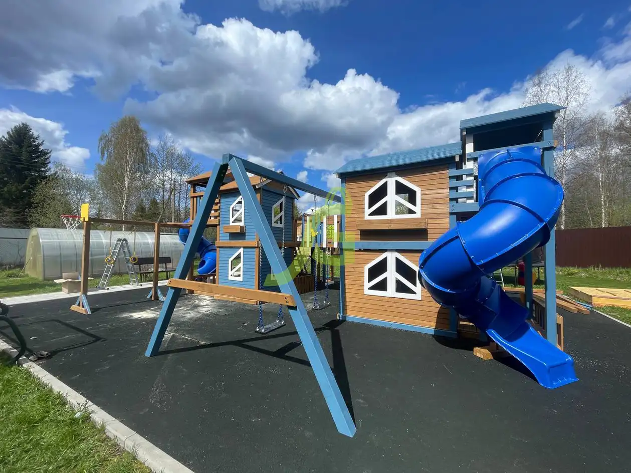 Грандиозный деревянный комплекс укомплектован сразу несколькими игровыми домиками, соединенными между собой переходами-мостиками. Это двухуровневые башни с домиками и верандами, с дизайнерскими окошками и четырьмя горками – волновыми разной длины и горками в виде труб.