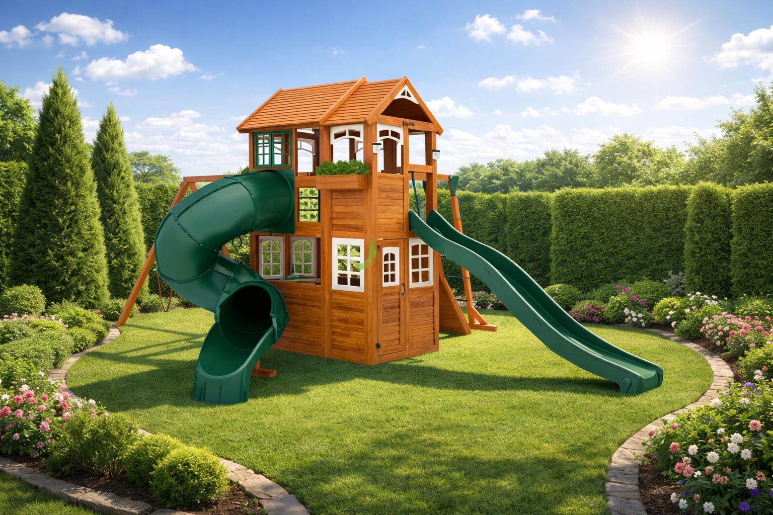 - - Закрытый двухуровневый игровой домик с дверью, деревянной крышей;