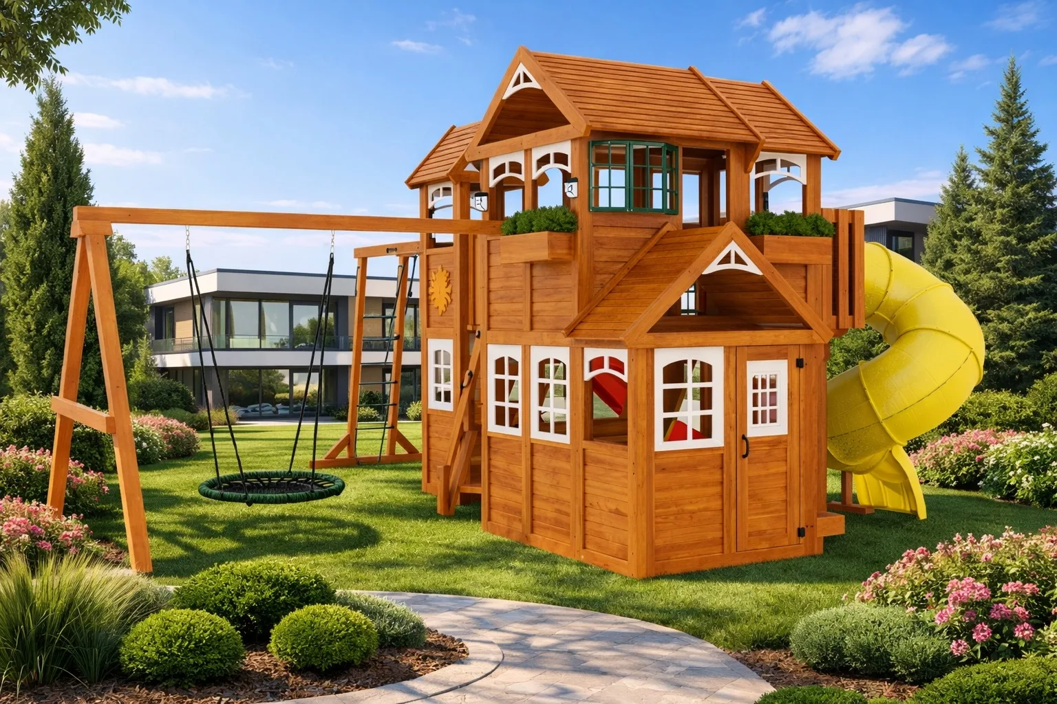 Детская площадка для дачи "Клубный домик Макси с трубой Luxe" включает:
