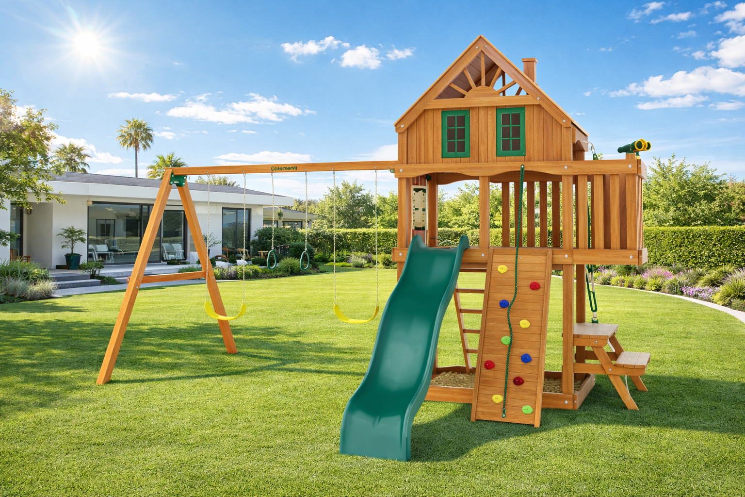 Купить детскую площадку, изготовленную из сухой древесины и укомплектованной крепкими американскими комплектующими, в состоянии каждый родитель. Конструкция крепкая, устойчивая, современная, многофункциональная – важные качества детской площадки.