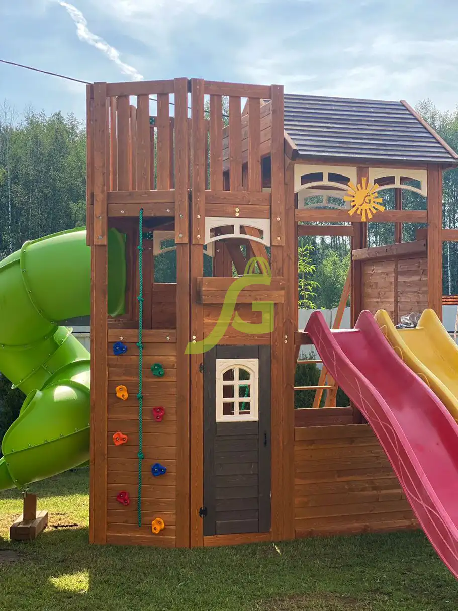 • - Закрытый двухуровневый игровой домик с дверью и деревянной крышей;