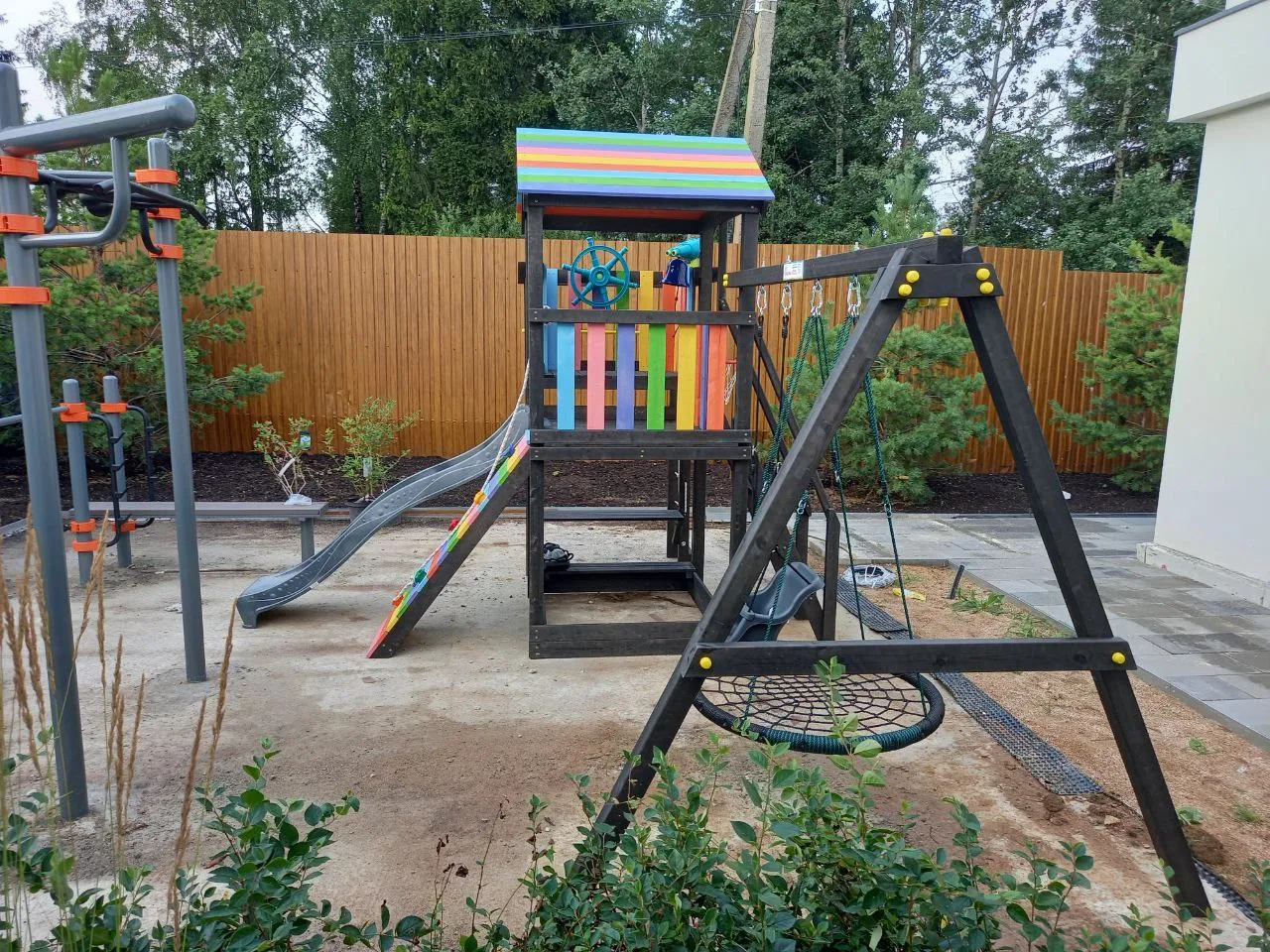 - Альпинистская стенка с пластиковыми выступами и канатом
