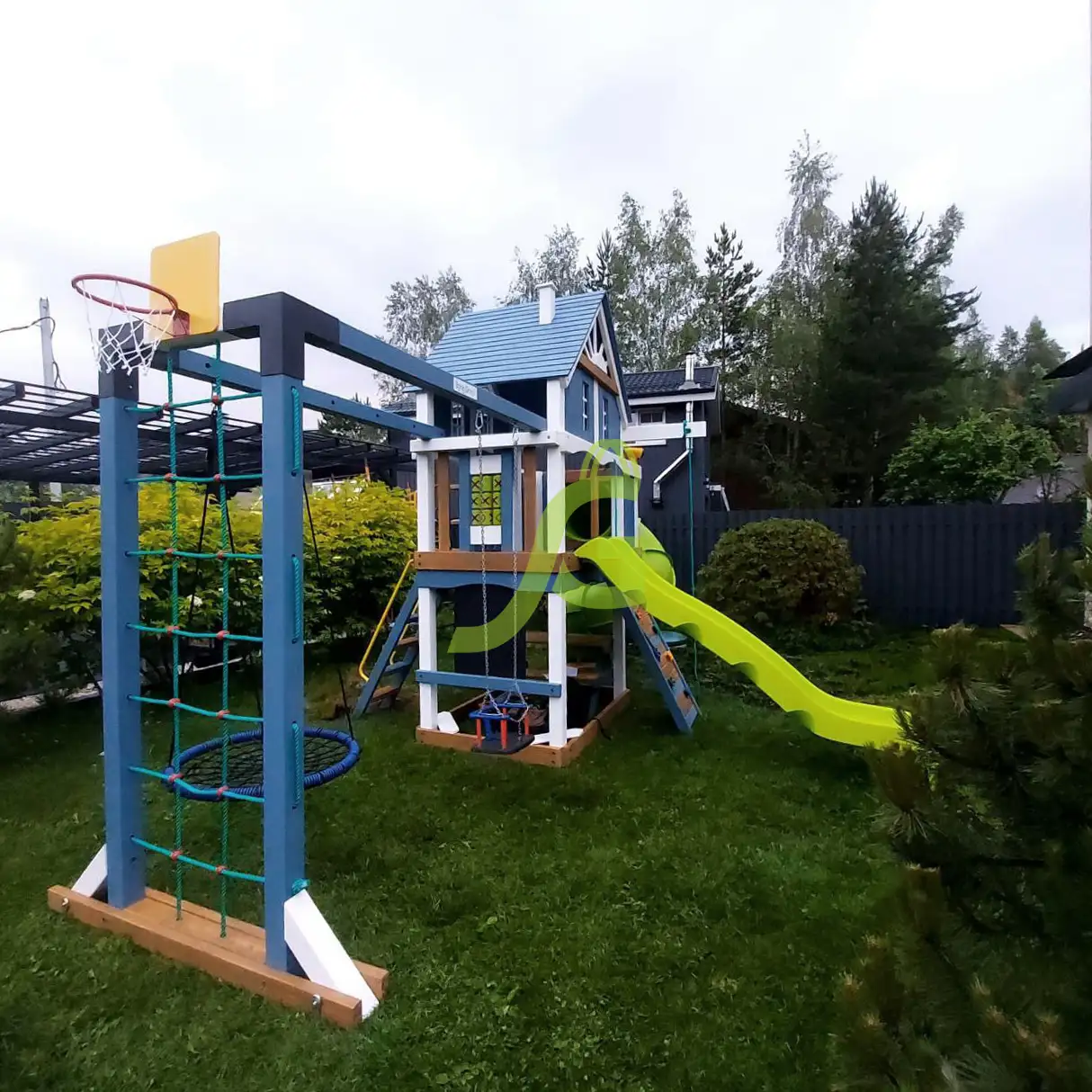 Обращаем Ваше внимание, что цвет установленной детской площадки может отличаться от представленных изображений на сайте. Специфика окраски нетоксичными пропитками допускает отклонения в цветовой гамме отгружаемых изделий вследствие различного цвета натурального природного сырья и естественных компонентов, используемых для производства площадок.