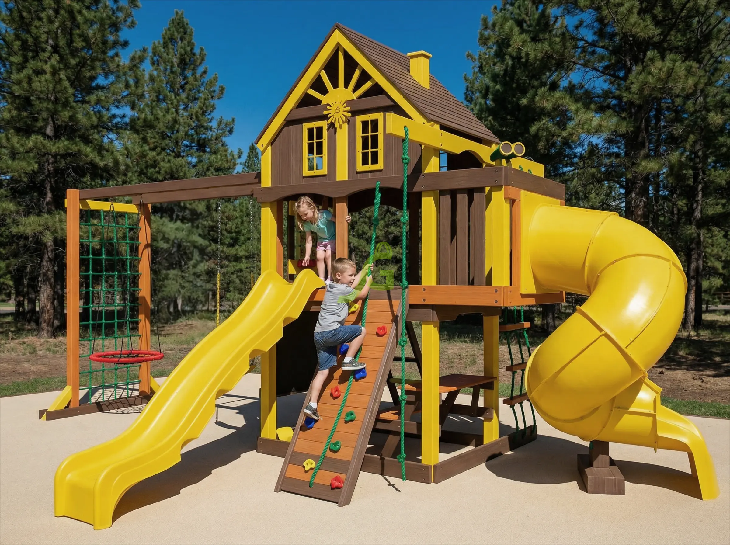 Обращаем Ваше внимание, что цвет установленной детской площадки может отличаться от представленных изображений на сайте. Специфика окраски нетоксичными пропитками допускает отклонения в цветовой гамме отгружаемых изделий вследствие различного цвета натурального природного сырья и естественных компонентов, используемых для производства площадок.