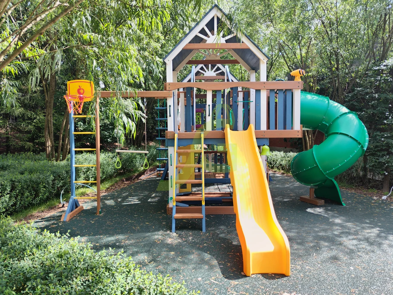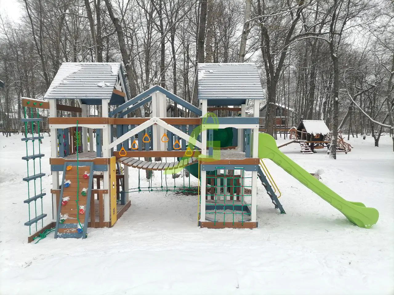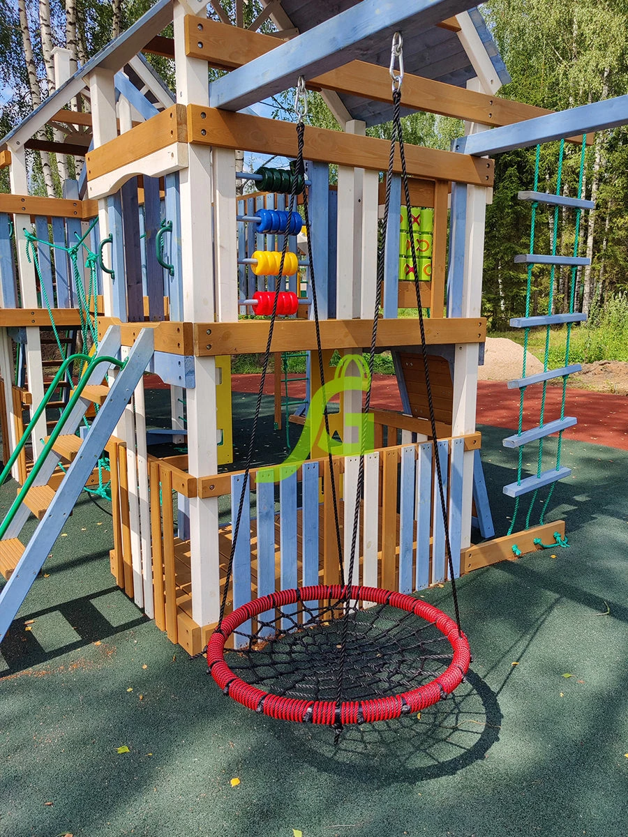 Для весёлого времяпрепровождения предусмотрено наличие волнообразной, винтообразной горок, качелей, панели для игры в «Крестики-нолики», песочницы.