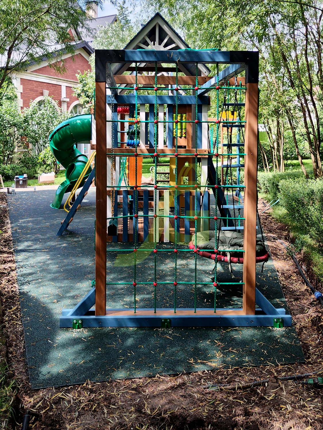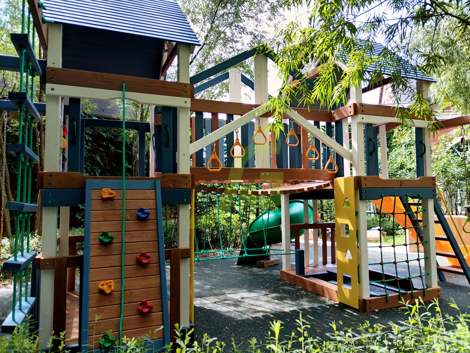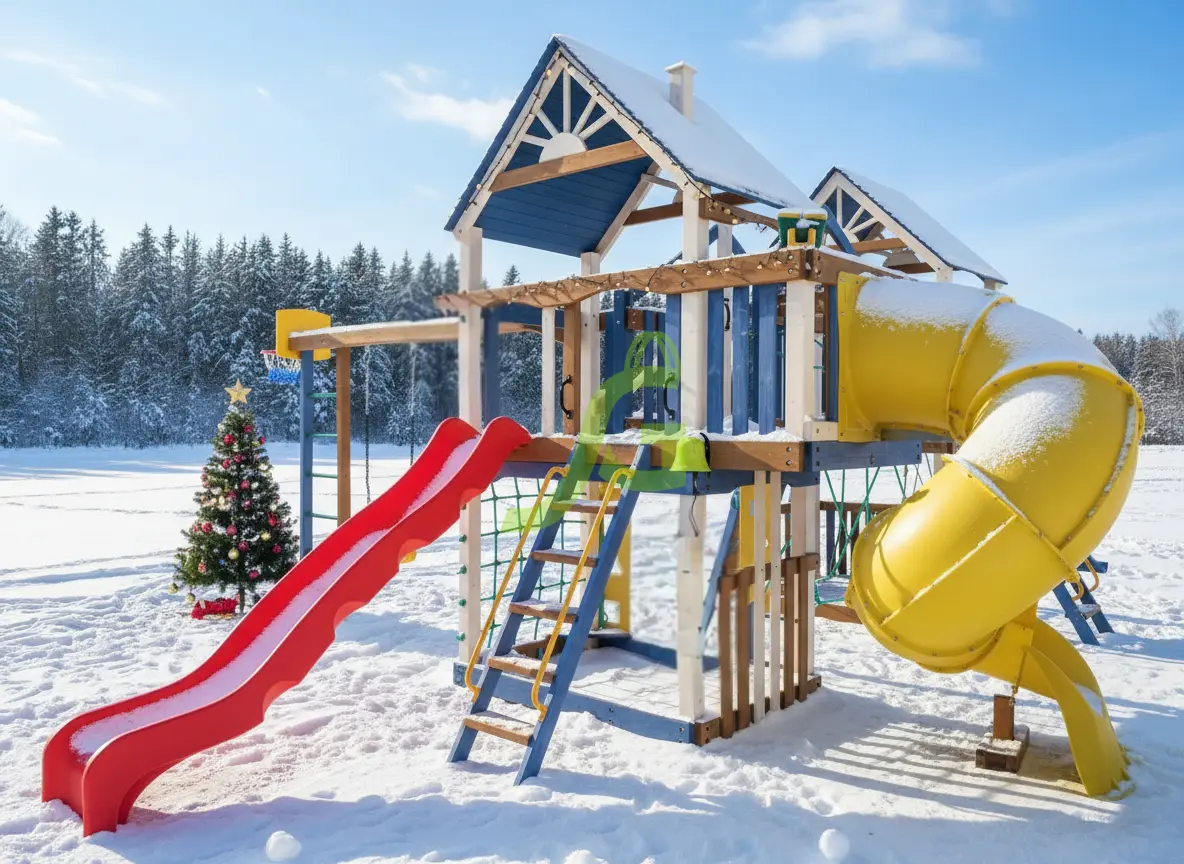 Для весёлого времяпрепровождения предусмотрено наличие волнообразной, винтообразной горок, качелей, панели для игры в «Крестики-нолики», песочницы.
